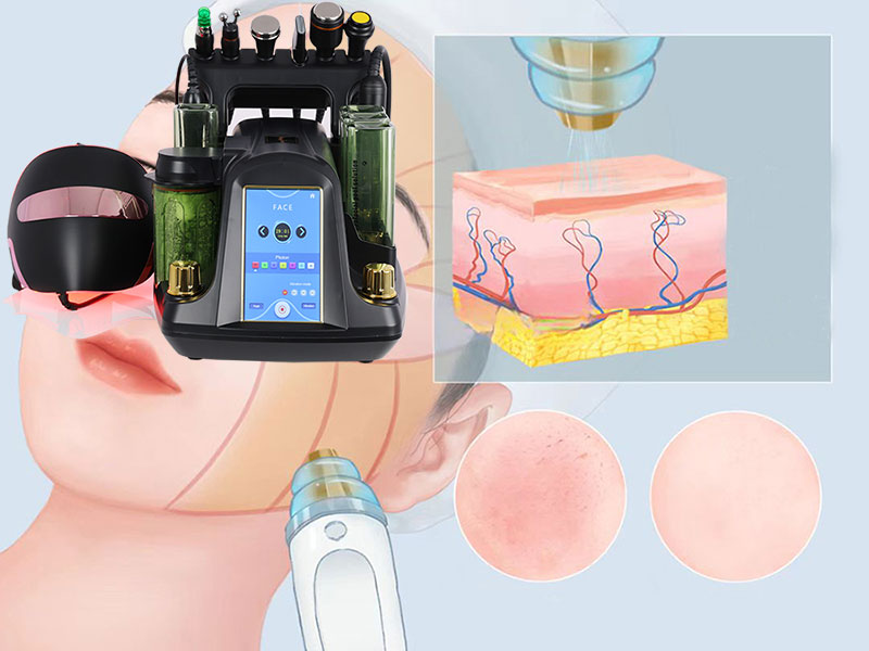 Este innovador dispositivo de tratamiento hidrafacial combina nueve tecnologías: la tecnología microeléctrica promueve el metabolismo celular y mejora la vitalidad de la piel; la tecnología de presión negativa al vacío limpia profundamente los poros; el plasma mata eficazmente las bacterias y combate la inflamación; la tecnología sónica promueve la penetración de esencias en las capas profundas de la piel; la tecnología de energía térmica RF levanta y tensa la piel, remodelando los contornos juveniles; una máscara de vibración de luz colorida utiliza ondas de luz multicolor para reparar con precisión el tono desigual de la piel, el enrojecimiento sensible y otros problemas; la tecnología de pulverización de oxígeno a alta presión introduce moléculas frescas en la piel, iluminándola; y la tecnología de guía de hielo reduce instantáneamente los poros y suaviza y calma la piel.