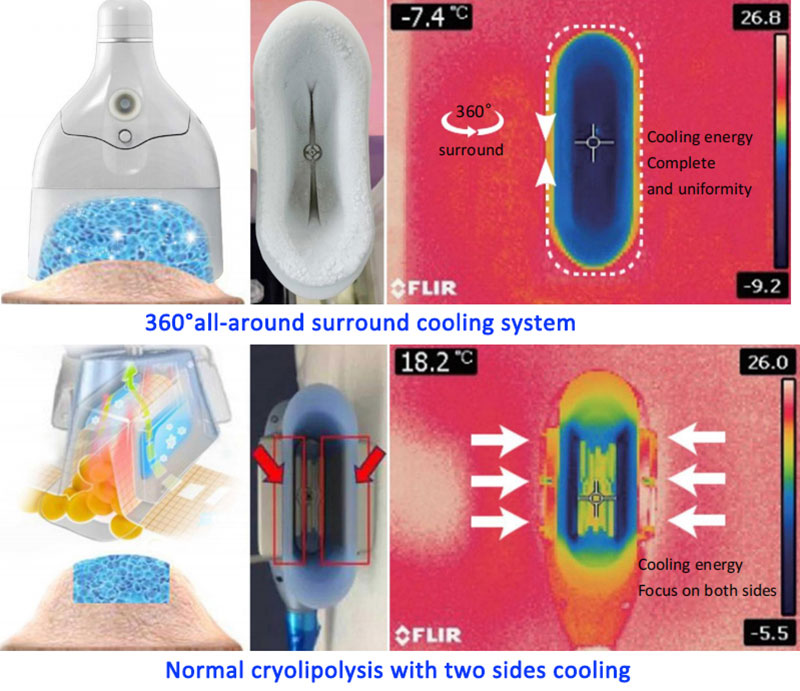 Sin embargo, este equipo de criolipolisis que es para la pérdida de peso utiliza tecnología de enfriamiento envolvente de 360°, enfriando completamente todo el cabezal de tratamiento. Trata la zona exacta de la piel que se succiona, proporcionando un enfriamiento integral y uniforme de 360° en el área tratada, lo que aumenta la eficacia del tratamiento en un 18,1%.