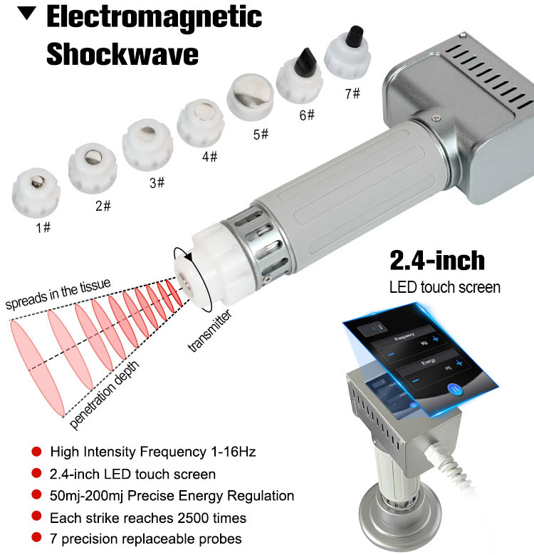 El mango de ondas de choque electromagnéticas está equipado con 7 sondas de tratamiento de precisión, con una pantalla táctil de 2,4 pulgadas para una operación conveniente. Frecuencia de alta intensidad de 1-16 hz, ajuste de energía preciso de 50 mj-200 mj, cada golpe alcanza 2500 veces.