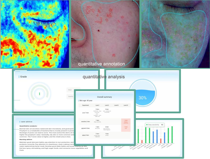 Este analizador de piel con escáner facial utiliza un algoritmo científico: anotación cuantitativa + análisis cuantitativo.