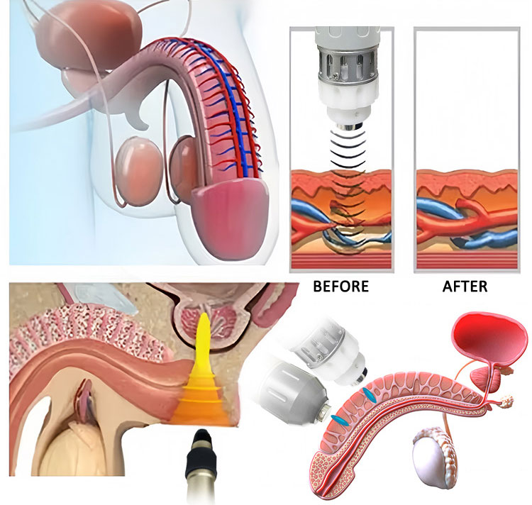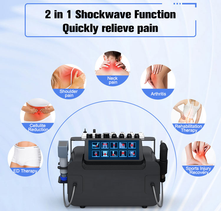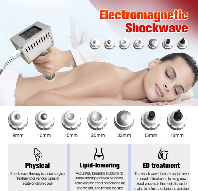 El equipo de terapia de choque promueve la deposición y disolución de calcio, mejorando la circulación sanguínea y aliviando el dolor agudo o crónico. El equipo también puede eliminar los grumos de grasa persistentes mediante vibración física para bajar de peso. Además, ayuda a reparar el tejido dañado de los cuerpos cavernosos del pene para restaurar su función normal.