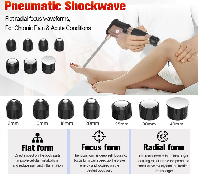 La máquina de terapia de ondas de presión radial tiene 3 formas: forma plana (6 mm, 10 mm, 15 mm, 20 mm) para impacto directo en las partes del cuerpo para mejorar el metabolismo celular y aliviar el dolor y la inflamación; forma de enfoque (40 mm) es autoenfoque profundo, para acelerar y enfocar la energía de la onda; forma radial (25 mm, 30 mm) es enfoque de capa intermedia, para distribuir la energía uniformemente y el área tratada es más grande.