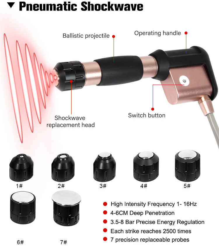 El mango de ondas de choque neumáticas también tiene 7 sondas de tratamiento de precisión, con una frecuencia de alta intensidad de 1-16 Hz y un ajuste de energía preciso de 3,5-8 bar, puede penetrar la piel a una profundidad de 4-6 cm y cada golpe alcanza las 2500 veces.