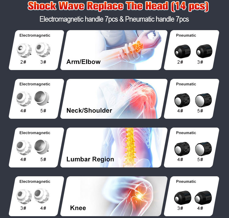 Las sondas 2# y 3# del mango de ondas de choque electromagnéticas, así como las 2# y 3# del mango neumático, son para las áreas del brazo y el codo. Las sondas 4# y 5# del mango electromagnético, así como las 4# y 5# del mango neumático, son para las regiones del cuello, los hombros y la zona lumbar. Las sondas 3# y 4# de los dos mangos son para las áreas de las rodillas.