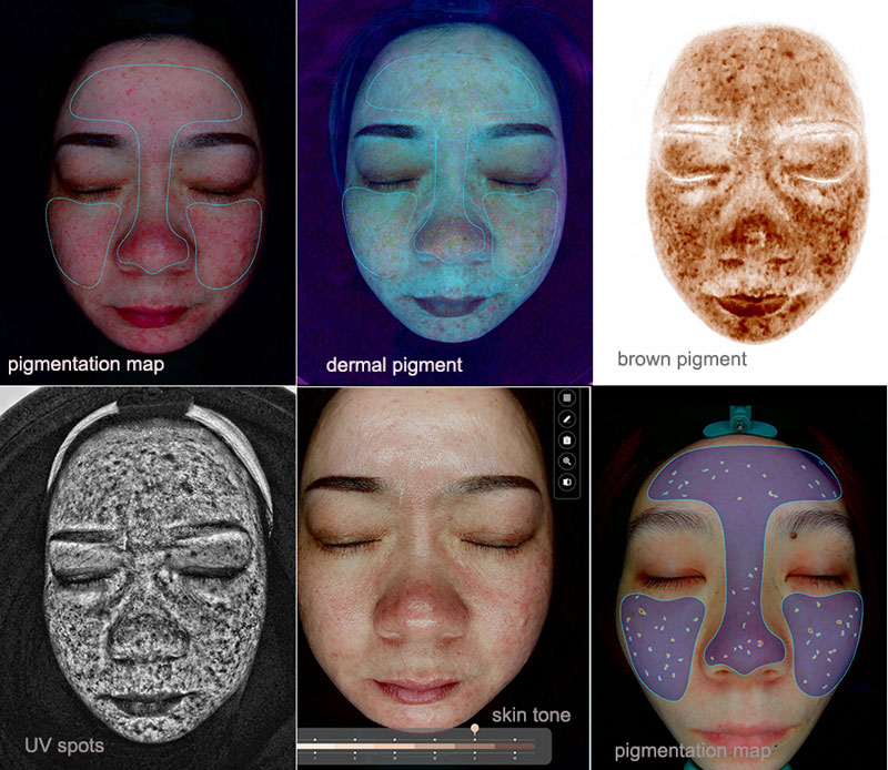 ◎El mapeo de pigmentos plomo analiza la distribución de todos los pigmentos en las capas profundas y superficiales de la piel facial (manchas pigmentadas, cicatrices de acné, hemoglobina, etc.).